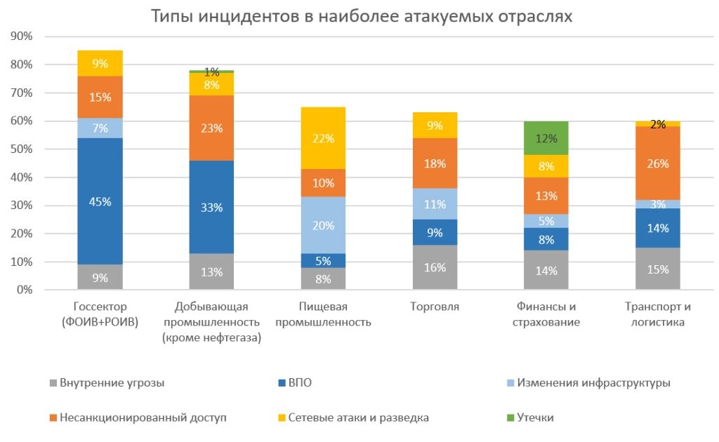 Сфера торговли остается «золотой жилой» для киберпреступников по всему миру за счет очень высокой зависимости от непрерывности бизнеса и ценности обрабатываемых данных (включая персональные данные клиентов, данные платежных карт и транзакции). Интересно, что здесь как раз сильно ниже категория вредоносного ПО – акцент смещается на внутренние угрозы и попытки несанкционированного доступа.