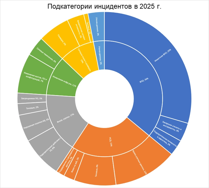 В этом году мы немного пересмотрели категории инцидентов для возможности погрузиться «вглубь» каждой из них и посмотреть статистику в других разрезах. Она представлена ниже.