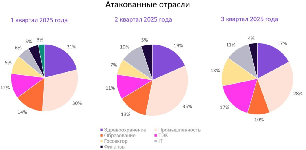 В 3-ем квартале хакеры чаще пытались атаковать организации из сфер промышленности (27% сработок сенсоров, -5 п.п. в сравнении со 2‑ым кварталом), ТЭК (17%, + 6 п.п.), здравоохранения (17%, -1 п.п.) и госструктур (13%, + 6 п.п.). Чуть меньше заражений было зафиксировано в IT-компаниях (11%), образовательных организациях (10%), кредитно-финансовой отрасли (4%) и телекоме (1%).