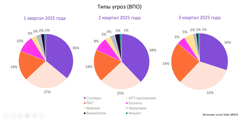 Большая часть сработок сенсоров пришлась на индикаторы присутствия APT-группировок (32% в 3-ем квартале, +7 п.п. в сравнении со 2-ым кварталом), программы-стилеры для кражи конфиденциальной информации (30%, -8 п.п.) и RAT — средства для получения удаленного доступа к ИТ-системам компании-жертвы (24%,+ 5 п.п.). В октябре 2025 года доля присутствия профессиональных хакеров вовсе выросла до 36%, доля стилеров — до 32%, а RAT осталась примерно на том же уровне и составила 23%.