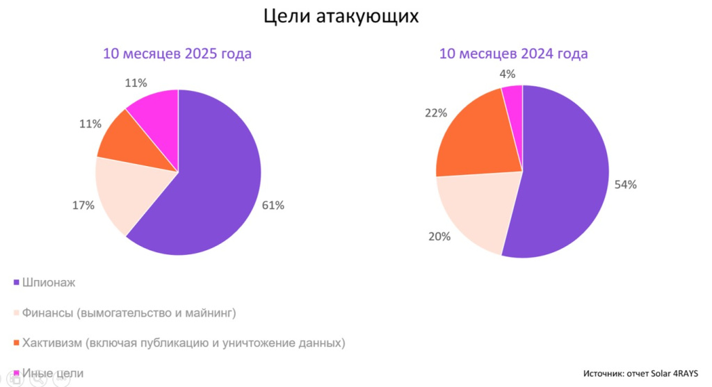 Главной целью профессиональных хакеров в этом году по-прежнему остается шпионаж (61%, + 7 п.п. год к году). Доля финансово-мотивированных атак снизилась на 3 п.п. год к году, до 17%, а хактивистских (с громкими политическими заявлениями) — на 11 п.п., до 11%. Это означает, что злоумышленники вместо «громких» атак чаще фокусируются на сложных и скрытных — хотя и публичные инциденты все еще встречаются.
