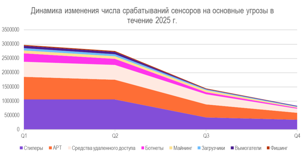 Так, в 2025 году сенсоры зафиксировали 9,3 млн случаев заражений в сетях 38,5 тыс. российских организаций. В среднем на одну компанию пришлось 242 подобных киберинцидента.