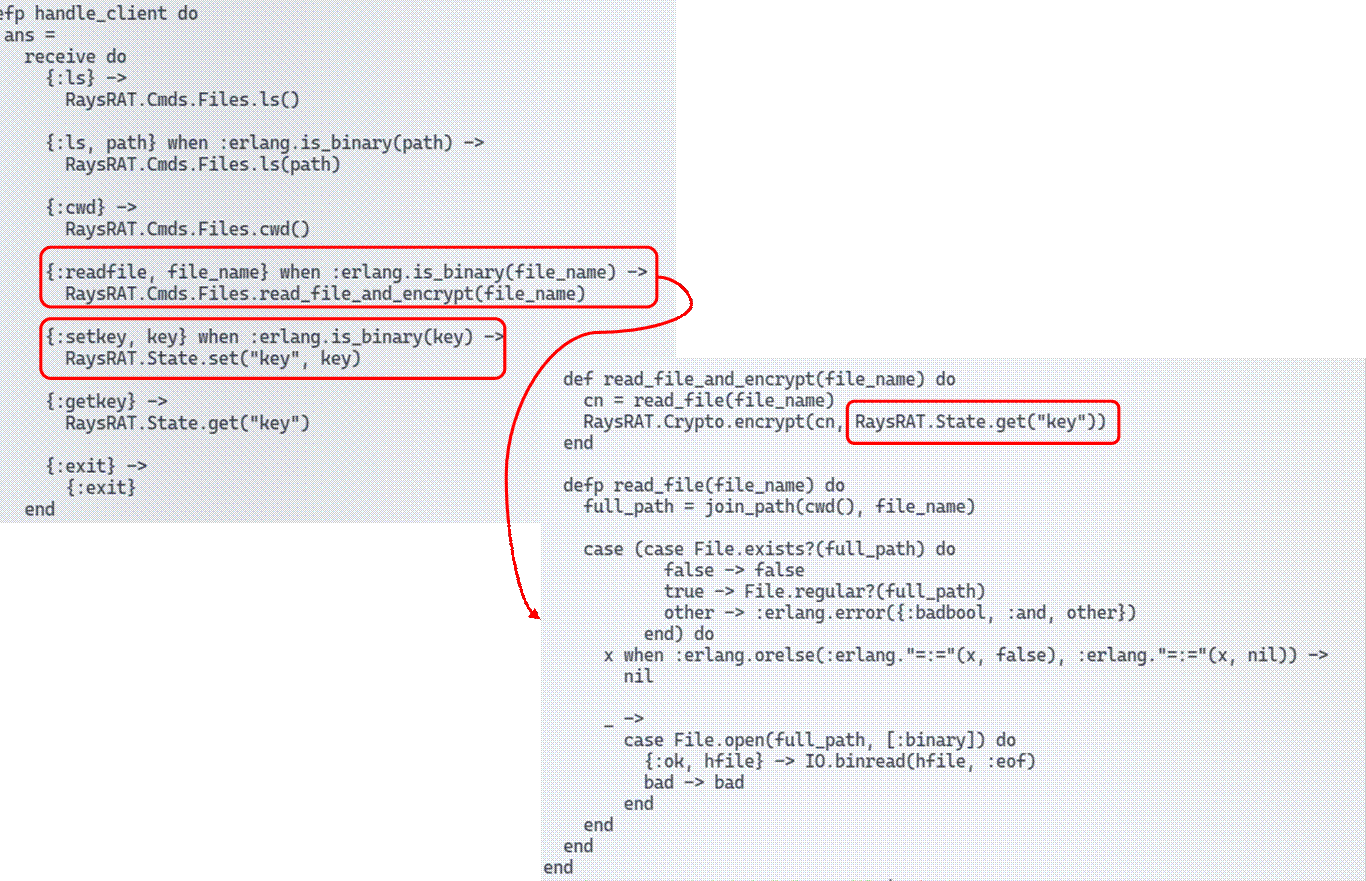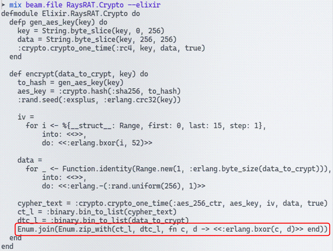 Так как задание на реверс, переходим к beam-файлам. Этот формат содержит байт-код для виртуальной машины erlang. По названию файлов приходим к тому, что это байт-код, сгенерированный эликсиром. Для декомпиляции есть прекрасный проект на GitHub. Рассмотрев разные файлы, приходим к выводу, что файлы при отправке шифруются. А ключ устанавливается заранее.