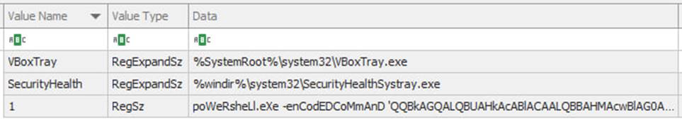 Так, при проверке раздела Run в SOFTWARE вы могли обнаружить ключ «1», который выполняет запуск закодированной в Base64 команды PowerShell.
