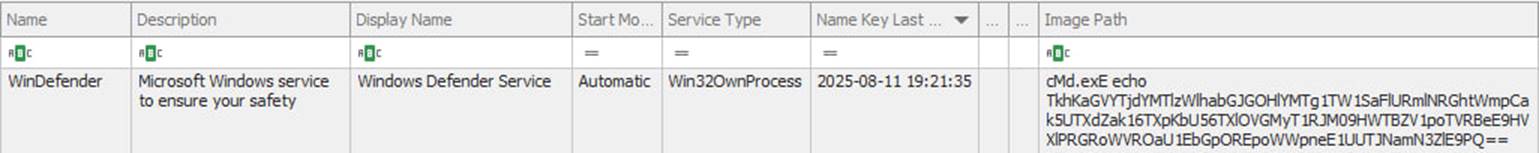 В результате анализа командлайнов всех служб вы можете обнаружить, что в системе установлена служба WinDefender (мимикрия под Windows Defender), которая запускает cmd-команду, содержащую Base64.