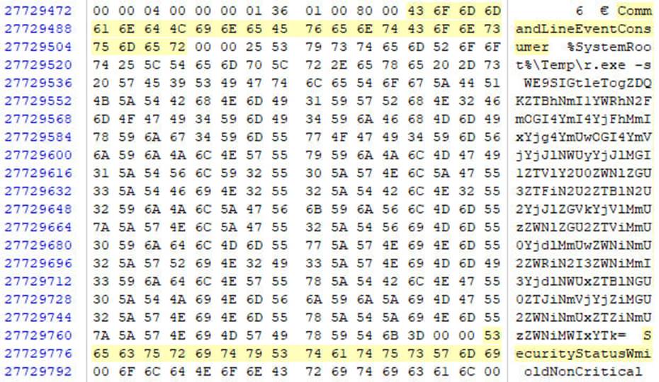 По данному файлу требуется поискать EventFilter.Name и EventConsumer.Name, в результате будет обнаружено 2 подписки: SCM Event Log (легитимно) и SecurityStatusWmi (что-то инородное)