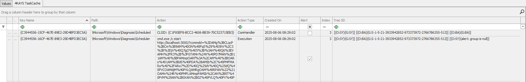 - В системе есть 2 задачи «\Microsoft\Windows\Diagnosis\Scheduled» и «\Microsoft\Windows\Diagnosis\Scheduler», которые, согласно DynamicInfo, созданы одновременно 06.08.2025 08:29:02+00:00.