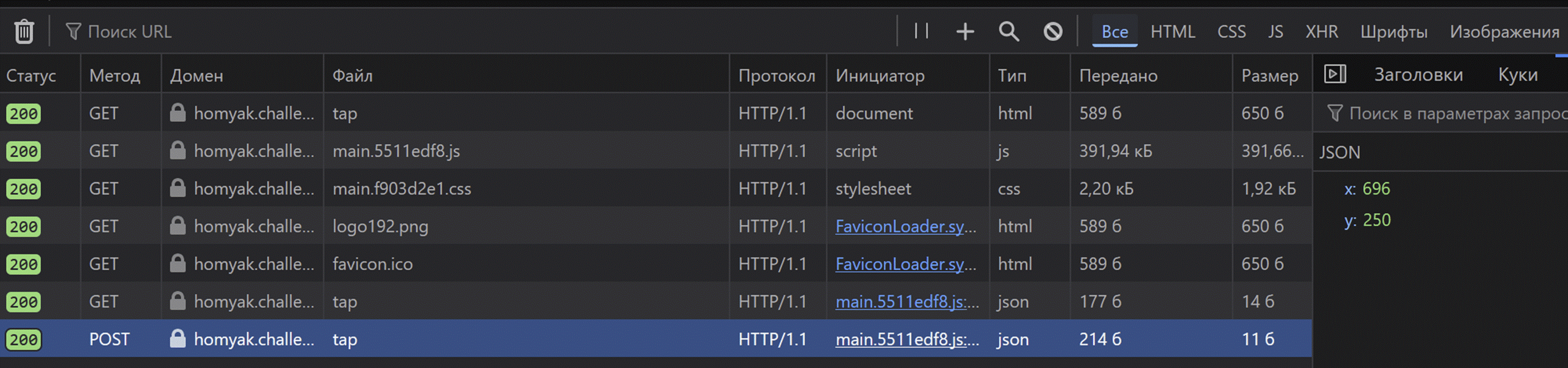 При нажатии на кнопку мы отправляем запрос с координатами клика. Можно также заметить, что при нажатии кнопки в одном месте сервер обнуляет клики.
