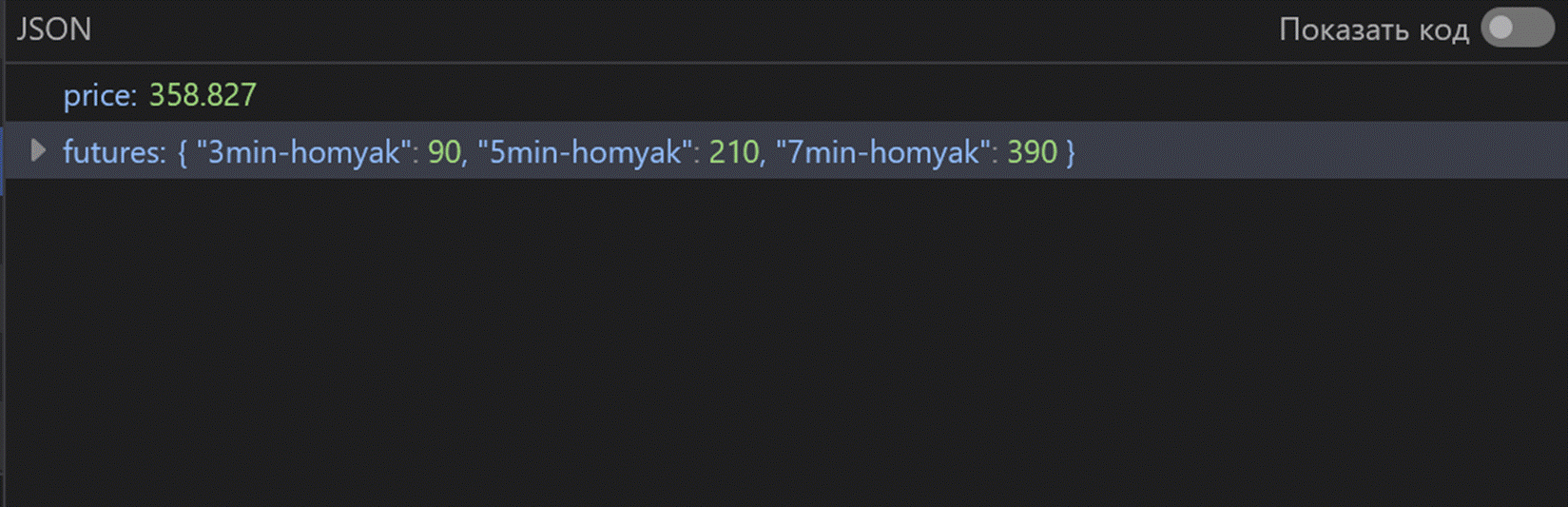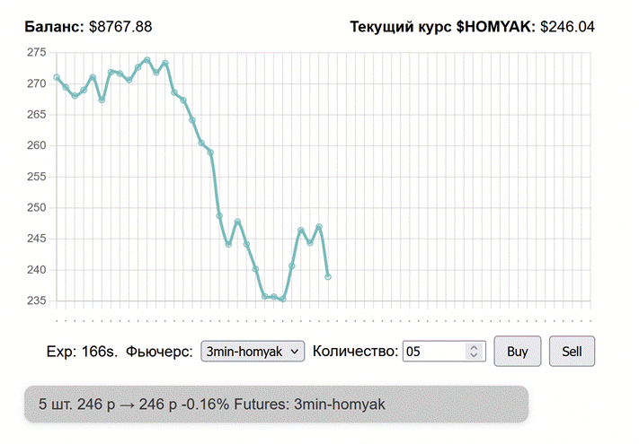 Обратимся к консоли, чтобы посмотреть, что происходит. Тут видно, что биржа каждые две секунды получает курс актива и время до экспирации фьючерсов, отправляя json { t:0 }.