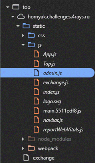 Видим некую admin.js, упоминания которой нет на фронте. Пробуем перейти на /admin — нас отправляет на главную страницу, поскольку страница еще в разработке.