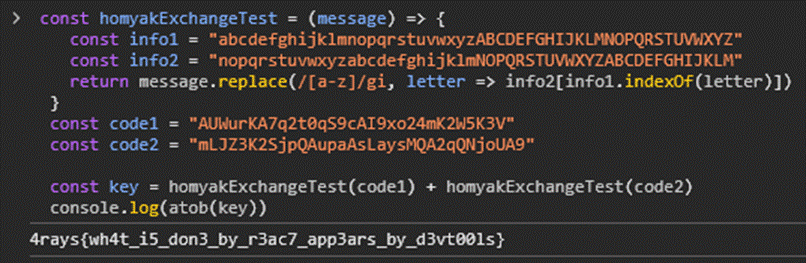 Повторяем данный код в любой JS-консоли и видим, что полученный key подозрительно похож на Base64. Переводим из Base64 и получаем флаг.