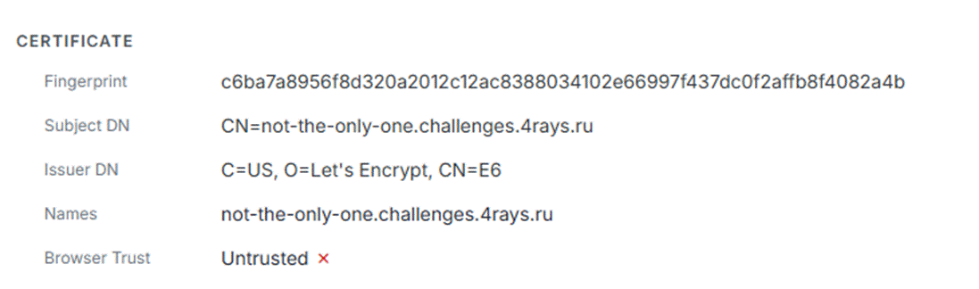 Производим поиск по хостам с таким же сертификатом и получаем второй адрес, который, очевидно, использовался как тестовый сервер ранее. Переходим по IP-адресу и видим, что здесь флаг не скрыт и публично виден.