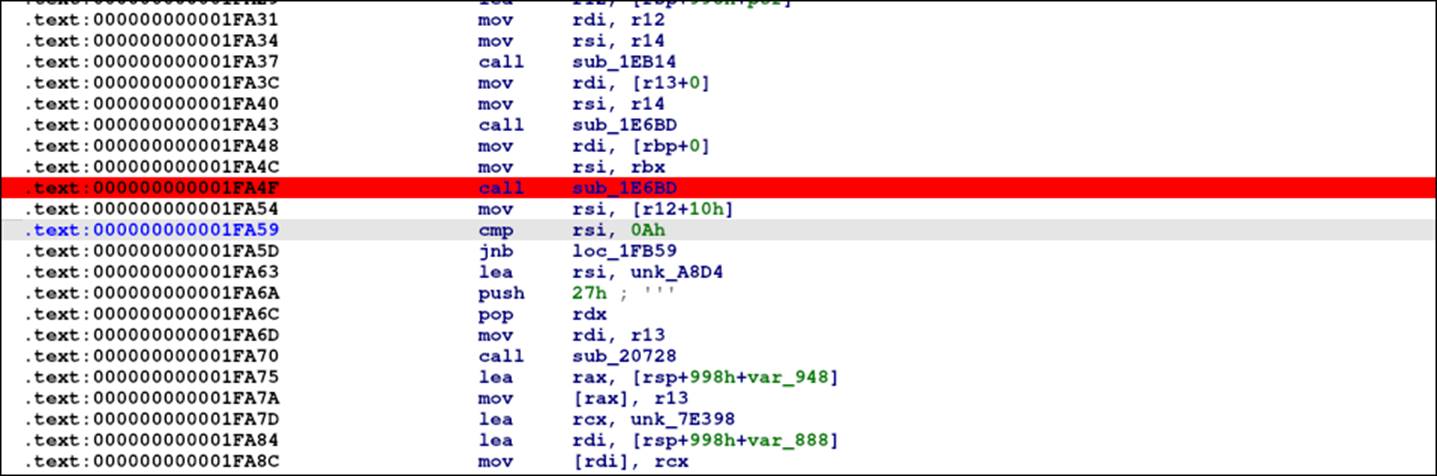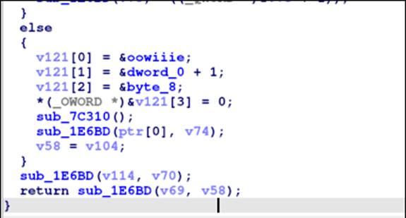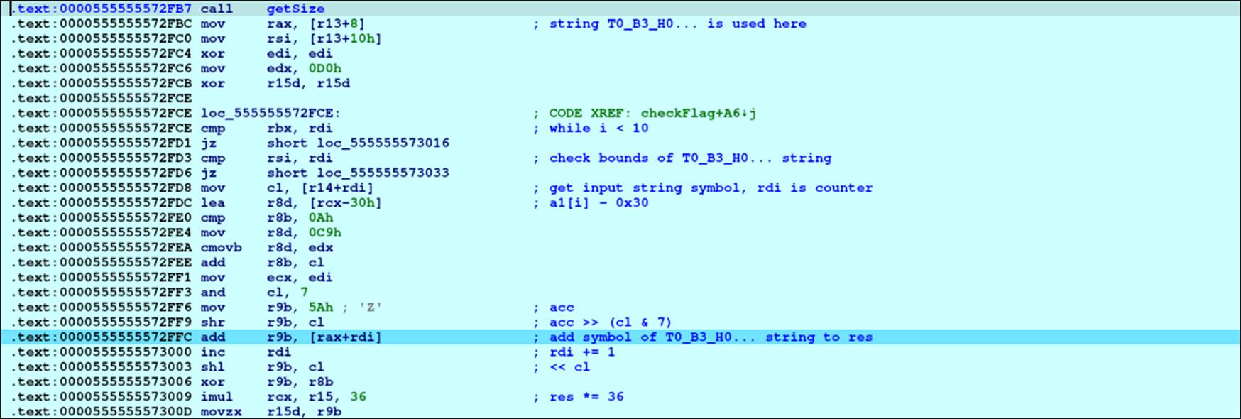 На этом моменте гипотеза подтверждается. Участок кода с проверкой символа } отвечает за проверку формата флага. Флаг выглядит так: 4rays{xxx…xxx}. Однако на данном этапе мы еще не знаем точный размер флага (чисто технически размер флага не нужен при решении задачи, однако мы захотели добавить его в код, чтобы направить решающих в правильную сторону). Также о функции sub_20728 можно сделать предположение, что, вероятно, она как-то связана с шифрованием строк. Эта гипотеза подтвердится, если после инициализации «потыкать» кросс-референсы на эту функцию.