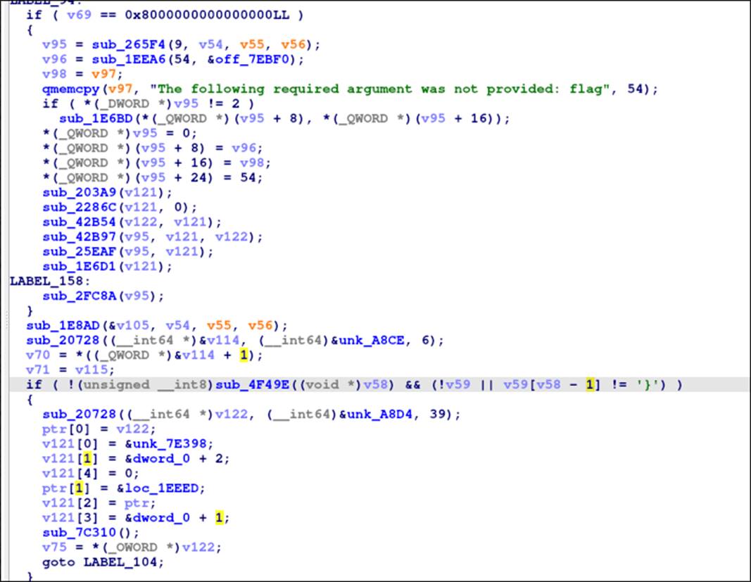Эта строка выводится в ветке false при проверке флага. В декомпиляторе видим символ }. Вероятно, этот участок кода отвечает за проверку формата флага.
