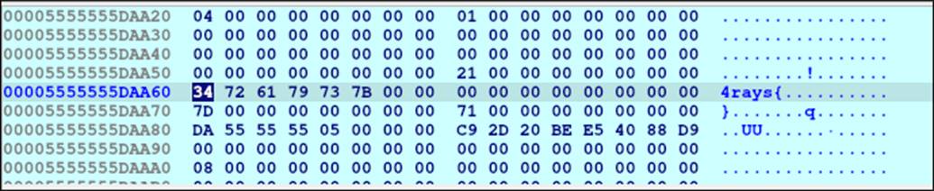 Попробуем потрейсить до этого участка в дебаггере. Замечаем функцию sub_20728, в которую передается указатель на какую-то последовательность байтов, а также число. После исполнения этой функции в памяти можно увидеть строку 4rays{.