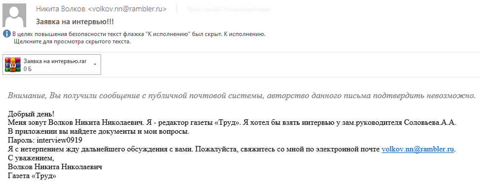 - Для обхода защитных решений в качестве вложений используются запароленные архивы.