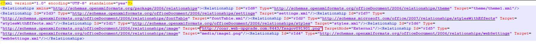 Файл 1.docx является документом-приманкой, но в то же время содержит в word\_rels\document.xml.rels ссылку на изображение вида: