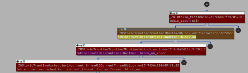 Подобным образом, но уже с помощью других функций можно находить, например, tokio::runtime::runtime::Runtime::block_on, с которой начинается асинхронное исполнение основного кода программы.