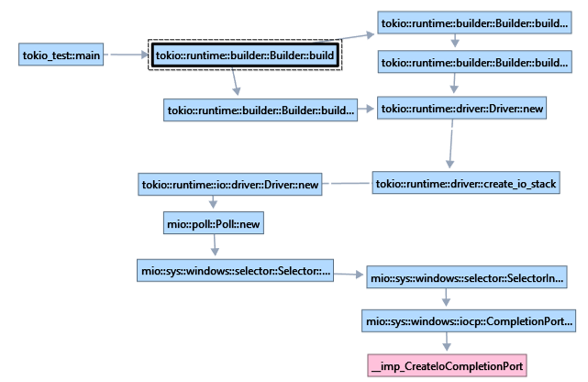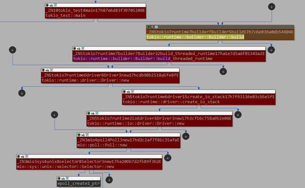 На примере ниже можно увидеть путь между функцией main и системным вызовом sys_epoll_create1. Второй функцией после main в этом графе является функция tokio::runtime::builder::Builder::build. Она используется для создания рантайма Tokio.