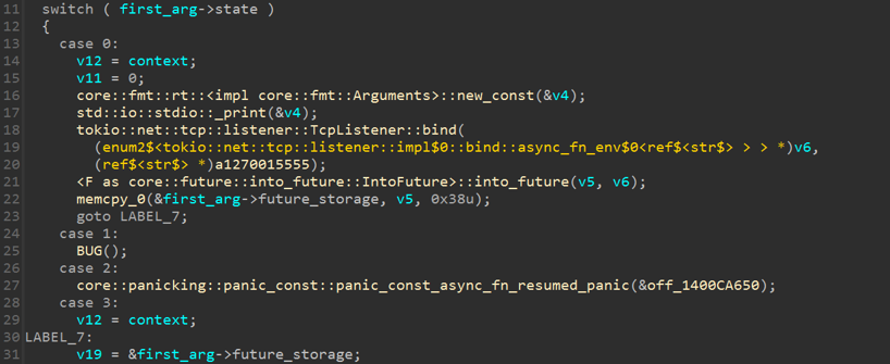 В дополнение ко всему, нужно понимать, как выглядит то, что мы ищем. Основной код в Tokio преобразуется в машину состояний, чтобы выполнять его асинхронно. После компиляции это может выглядеть как switch-case-выражение, ключом которого является структура в первом аргументе функции. Можно отмечать такие функции и более подробно их анализировать — возможно, именно там находится то, что вы ищете.