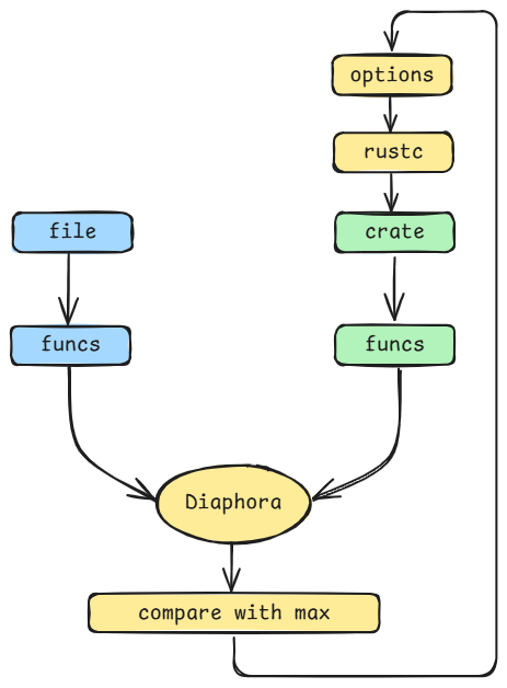 Одним из способов решения этой проблемы может быть подбор параметров оптимизации. Для того чтобы это сделать, нужно распознать в исследуемом файле несколько библиотечных функций, а после этого компилировать выбранный крейт с разными параметрами и каждый раз сравнивать получившиеся функции, например, с помощью Diaphora. Схематично этот процесс показан на рисунке ниже.