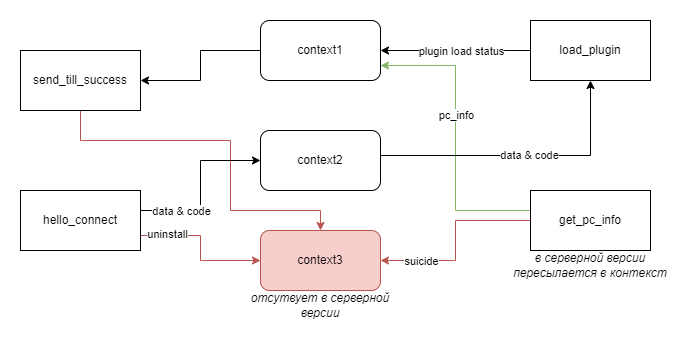 Функция send_pc_info собирает и отправляет информацию о компьютере. Проверяет наличие отладчиков и других средств анализа. Если они присутствуют, завершает программу. В серверной версии разработчики изменили подход. Раньше она посылала информацию напрямую, по теперь использует для этого контекст. При соединении бэкдоры обмениваются системной информацией друг с другом каждые несколько секунд.