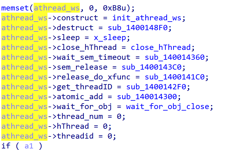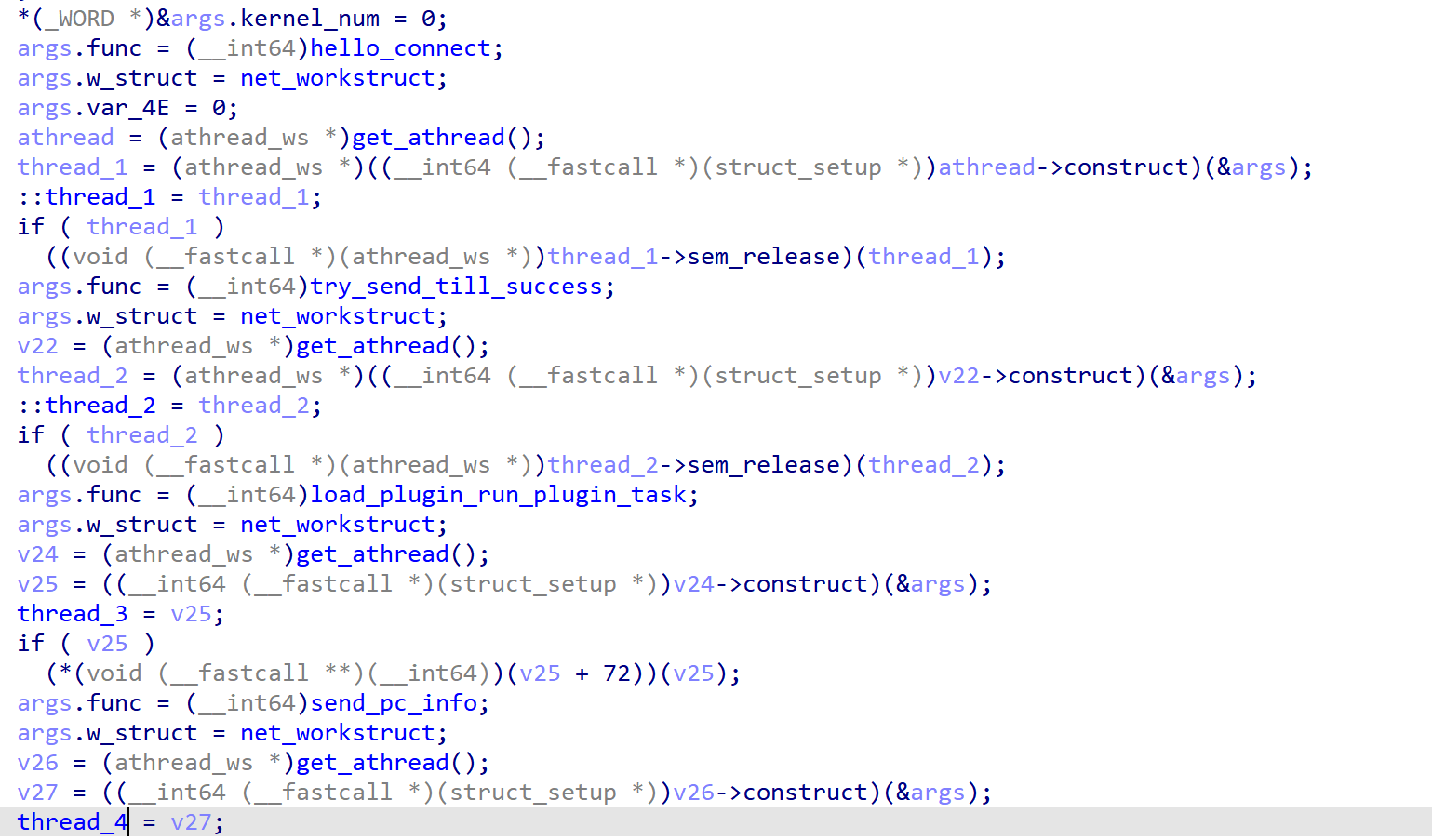 В бэкдоре есть кастомный класс потока, а также несколько потоков, которые взаимодействуют с друг другом через специальные контексты. Они запускают основную логику работы импланта.