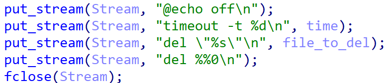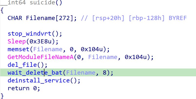 Для самоудаления у бэкдора имеется специальная функция suicide, которая удаляет закрепления и файлы. Для удаления файлов создается bat-файл, который через некоторое время удаляет нужный файл.