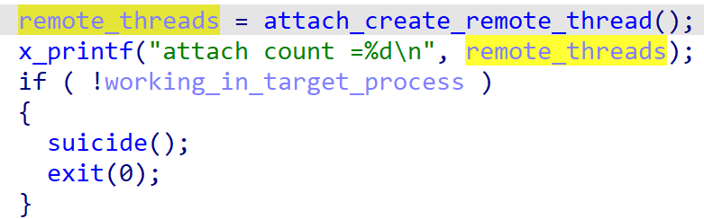 Бэкдор также пытается обнаружить дебаггеры и песочницу. Он имеет простейшие проверки обратной разработки. Вредоносная нагрузка запускается, только если в параметрах передается специальное значение из конфига. В случае провала проверок запускается функция самоликвидации.