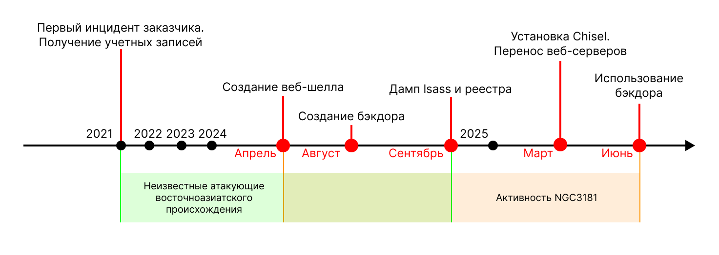 Проведя ретроспективный анализ инфраструктуры, мы обнаружили следы другой атаки, началом которой можно считать 2021 год. Тогда атакующим удалось получить учетные записи нескольких сотрудников, что позволило в дальнейшем развивать атаку в разные сегменты инфраструктуры.